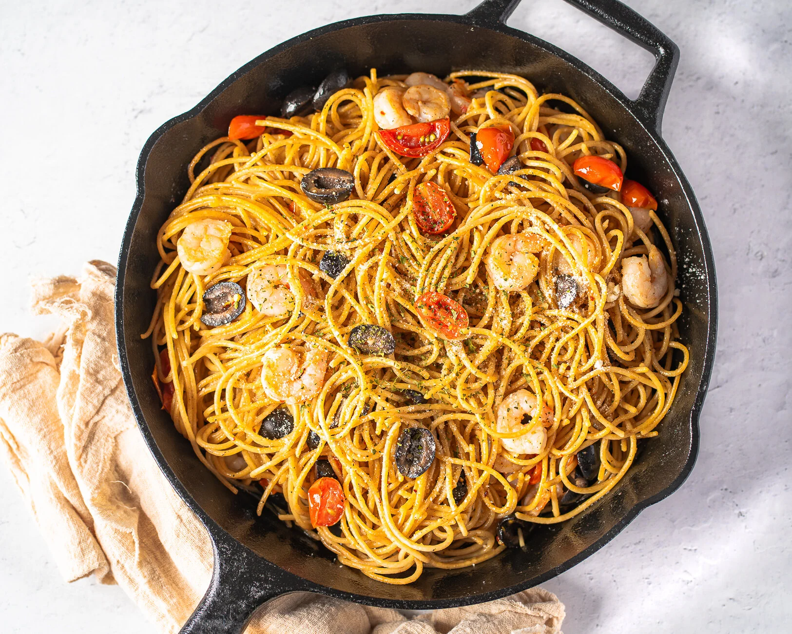 Decided to go with a lighter meal this time around since we've really enjoyed a ton of delicious smoked BBQ recently (don't worry, there'll be plenty more to come). This healthy Mediterranean Pasta with Shrimp is SUPER EASY, light and full of flavor. You can really taste the fresh ingredients in this and the high fiber from the whole wheat pasta will keep you full so you can enjoy this meal throughout the week! Healthy meal prep ideas, anyone?